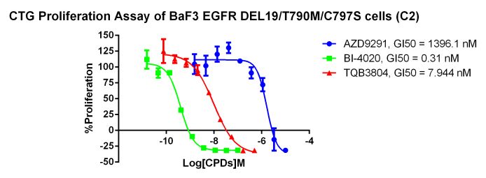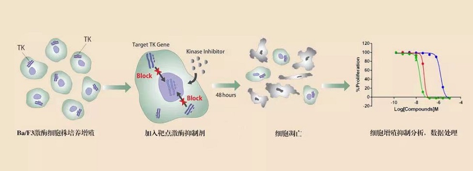 我們結(jié)合自己多年在細(xì)胞領(lǐng)域的豐富經(jīng)驗(yàn),在 Ba/F3(小鼠原B細(xì)胞)上進(jìn)行改造,引入相應(yīng)表達(dá)激酶基因,這些基因能作為Ba/F3的驅(qū)動(dòng)基因,讓Ba/F3不再依賴IL-3而增殖,進(jìn)而激酶基因成為Ba/F3增殖依賴的驅(qū)動(dòng)基因,用于評估小分子藥物對激酶的靶向抑制作用。