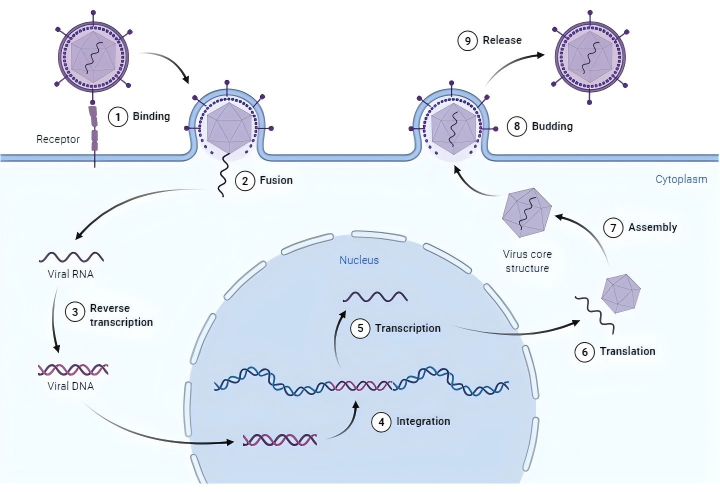 慢病毒(LV)是一種有包膜的病毒,最常見的是VSV-G,它通過與特定的細(xì)胞表面蛋白(比如LDLR)結(jié)合,隨后進(jìn)行膜融合進(jìn)入細(xì)胞,將含有其遺傳信息的病毒RNA注入細(xì)胞質(zhì)。這種單鏈病毒RNA通過逆轉(zhuǎn)錄轉(zhuǎn)化為DNA。病毒DNA進(jìn)入細(xì)胞核,并通過病毒整合酶整合到宿主細(xì)胞基因組中。