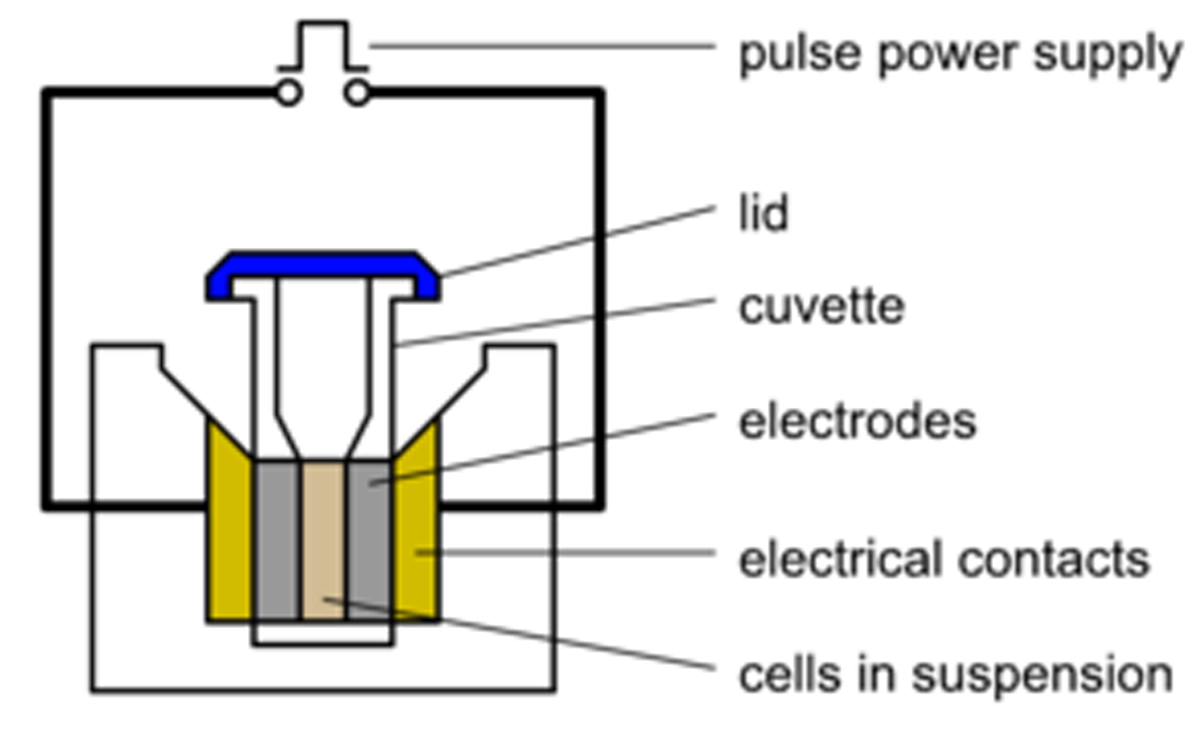 體外電穿孔時(shí),將靶細(xì)胞懸浮液與待導(dǎo)入細(xì)胞的質(zhì)粒DNA在導(dǎo)電溶液中混合,然后放入比色皿中(圖1)。電穿孔比色皿的樣品室兩側(cè)各有一塊金屬板,電流可以通過(guò)混合物。將比色皿放入電穿孔儀的腔室中,該腔室配有相應(yīng)的電觸點(diǎn),使比色皿形成電路。電穿孔儀上的控制器允許用戶設(shè)置待輸送電脈沖的電壓、波形和持續(xù)時(shí)間,這些參數(shù)應(yīng)根據(jù)靶細(xì)胞類(lèi)型進(jìn)行優(yōu)化。然后,電脈沖通過(guò)樣品室。