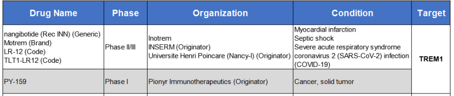 TREM1作為一個(gè)新靶點(diǎn),全球范圍內(nèi)披露的研發(fā)管線不多,針對TREM1靶點(diǎn)有2款產(chǎn)品進(jìn)入臨床,1款產(chǎn)品即將進(jìn)入臨床(Celsius公司的CEL383,適應(yīng)癥為炎癥性腸?。_m應(yīng)癥主要為急性感染性疾病、自身免疫性疾病和癌癥。目前TREM1靶點(diǎn)針對癌癥的臨床前藥物比較活躍的是nangibotide(處于臨床II/III期)及PY-159(處于臨床I期)。其中較引人關(guān)注的是Pionyr Immunotherapeutics公司的TREM1抗體PY159正在與帕博利珠單抗聯(lián)合用于晚期實(shí)體瘤患者的Ia/Ib期研究。PY159 是一種人源化單克隆抗體,能特異性地結(jié)合表達(dá)在髓系細(xì)胞上的TREM1,并通過交聯(lián)TREM1/DAP12 復(fù)合物誘導(dǎo)下游信號傳導(dǎo),發(fā)揮激動劑的作用。2023年 ASCO報(bào)道的 PY159 的用于冷腫瘤相關(guān)瘤種的I期的臨床研究,結(jié)果顯示總體安全性可控,療效方面 ORR 為 6%,DCR 為 33%,其中胰腺癌患者展現(xiàn)出較好的療效??偟膩碚f,TREM1靶點(diǎn)藥物的作用機(jī)理和效果還不是非常明確,正在研發(fā)的藥物療效也不是很出色,未來前景還值得繼續(xù)觀察。