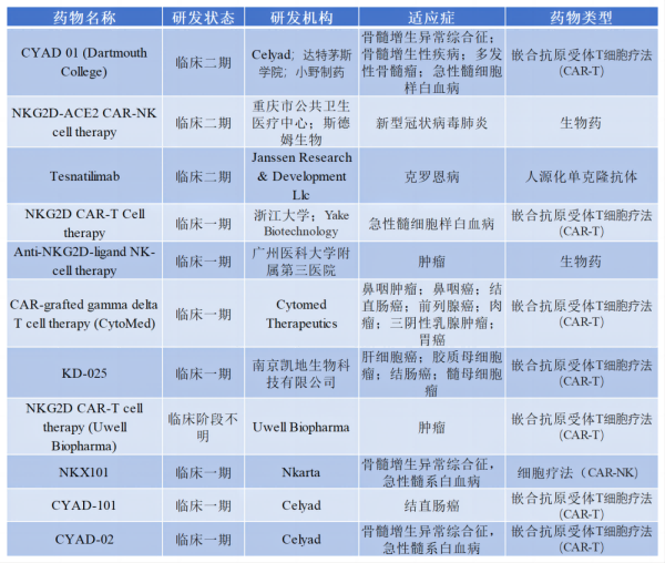 截至目前,全球有11種針對(duì)NKG2D的在研藥物,主要集中在臨床早期,其中以CAR-T細(xì)胞療法為作用機(jī)制的就有10種。而CAR-NK療法因?yàn)闆]有發(fā)現(xiàn)細(xì)胞因子釋放綜合癥及神經(jīng)毒性等副作用,因而比CAR-T療法具有優(yōu)勢(shì),這可能是由于NK細(xì)胞本身不容易導(dǎo)致過高的細(xì)胞因子分泌。除此之外CAR-NK療法不需要以患者的自體免疫細(xì)胞作為來源、治療成本更低等優(yōu)勢(shì)可能使它成為CAR-T療法的一大競爭對(duì)手。除抗腫瘤藥物外,強(qiáng)生旗下的楊森公司針對(duì)該靶點(diǎn)在自身免疫疾病方面的作用開發(fā)了一款單抗類藥物,通過抑制該靶點(diǎn)活性來降低克羅恩病患者的炎癥反應(yīng)。
