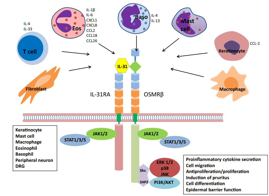 IL-31(白細胞介素31)于2004年被Dillon等人發(fā)現,是一種四螺旋束細胞因子,有2個長螺旋和2個短螺旋,屬于糖蛋白130 (gp130)/IL-6細胞因子家族。IL-31最初被證明是由激活的輔助T細胞產生的,尤其是Th2細胞、肥大細胞、巨噬細胞和樹突狀細胞,此外在嗜酸性粒細胞、嗜堿性細胞等中也有IL-31的表達。IL-31與瘙癢感覺神經纖維表面IL-31RA亞基結合,激活OSMR亞基發(fā)生異構,主要通過磷脂酰肌醇30-激酶/蛋白激酶(PI3K/AKT)通路、Janus激酶/信號轉換器和轉錄激活因子(JAK/STAT)通路及絲裂原激活的蛋白激酶(Ras/Raf/MAPK)通路。IL-31信號通路的下游轉錄因子的激活會參與不同的基因表達,比如炎癥、遷移、分化、(抗)增殖、細胞存活和屏障功能等。