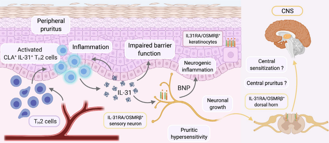 CLA T2細胞是特應性皮炎(AD)患者循環(huán)中豐富的過敏原反應性T細胞,通過CCL17和CCL22信號被募集到AD感染的皮膚。在皮膚中,CLA T2細胞分泌IL-31,進而激活表達IL31RA/ OSMR β-的皮膚感覺神經、天然免疫細胞(包括DC)、單核細胞和嗜酸性粒細胞以及角質形成細胞。在AD皮膚中,角質形成細胞顯示IL31RA/OSMRβ表達水平升高,導致對IL-31的接受性增強。皮膚IL-31信號通過IL-31介導的終分化基因(如聚絲蛋白和脂質包膜減少)的抑制,導致外周瘙癢、(神經)炎癥和屏障功能受損?;罨慕琴|形成細胞分泌各種化學引誘劑,觸發(fā)表達IL -31的CLA Tu2細胞額外募集到炎癥部位,形成皮膚炎癥和瘙癢的反饋循環(huán)。人和犬的感覺神經元表達IL31RA/ OSMRβ主要在TRPV1共表達的神經元中。IL-31與IL31RA/ OSMR β結合后,通過下游信號通路上調瞬時受體電位香草酸受體1(tansient receptor potential vanilloid,TRPV1)及瞬時受體電位受體A1(TRPA1)表達,增強神經元興奮性,促進晚期及慢性瘙癢形成。
