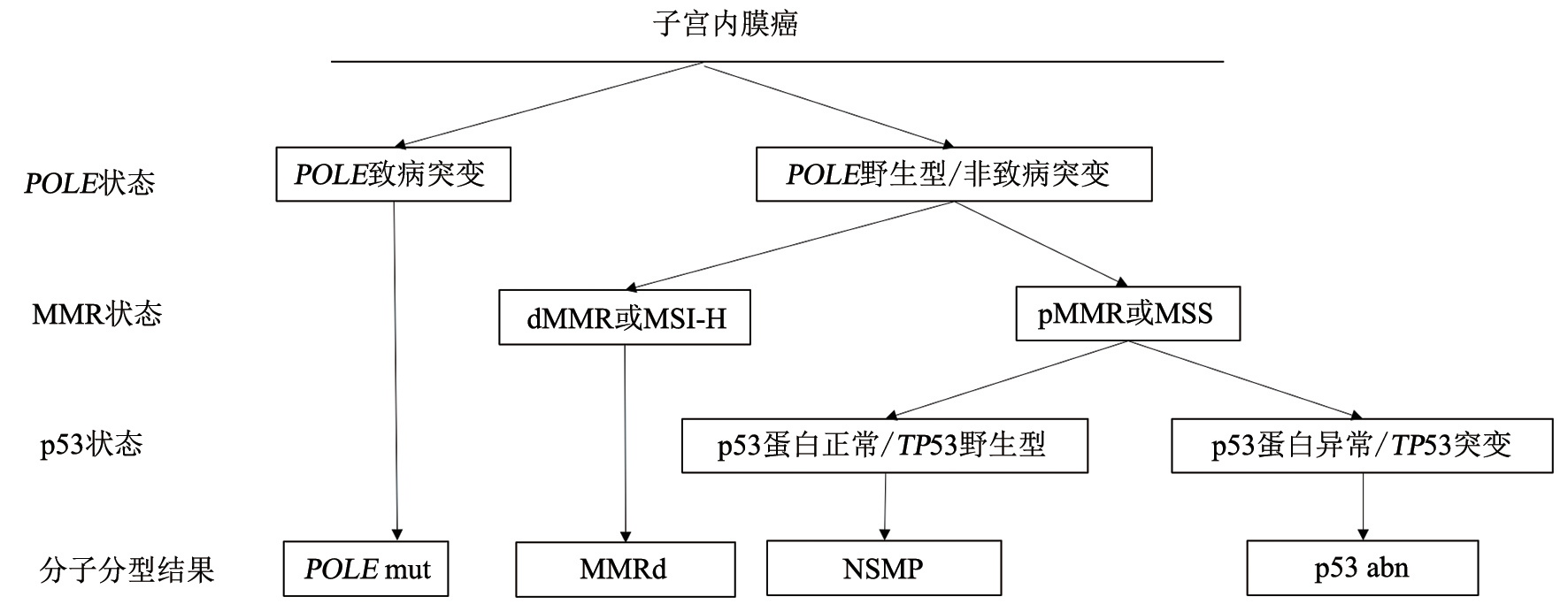 2013年美國癌癥基因組圖譜(TCGA),依據(jù)子宮內(nèi)膜癌全基因組、轉(zhuǎn)錄組、蛋白組等多組學檢測結果,將其分為POLE突變型、微衛(wèi)星不穩(wěn)定突變型、低拷貝數(shù)型和高拷貝數(shù)型等4種類型。2023年國際婦產(chǎn)科聯(lián)盟(International Federation of Gynecology and Obstetrics,F(xiàn)IGO)分期建議,所有的子宮內(nèi)膜癌EC患者均應完善分子分型檢測。